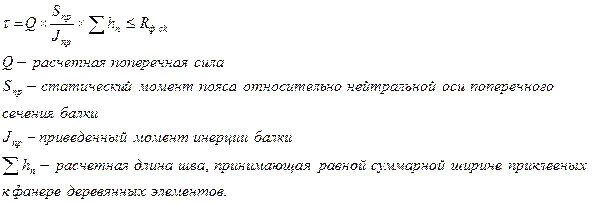 Проверка напряжений в клеевых швах м/у шпонами фанеры по форуле: