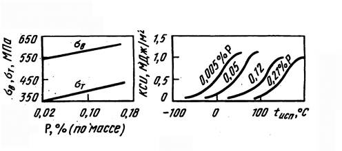 Рис.4 Влияние фосфора на σв и σт и ударную вязкость KCU низкоуглеродистой феррито-перлитной стали (0,2 % С, 1 % Мn).