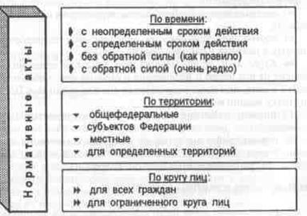 · Действие нормативного акта распространяется на определенную территорию и зависит от того, каким органом он издан. В связи с этим содержащиеся в нормативных актах нормы права можно подразделить на следующие: - общефедеральные нормы (действуют на всей территории РФ); - нормы субъектов РФ (действуют на территории данного субъекта Федерации); - местные нормы (действуют на территории одного района, города); - нормы, действующие на определенной территории (например, в районах Крайнего Севера и др.). · Круг лиц, подпадающих под действие правового акта, зависит от его целей и назначения и обычно или прямо оговаривается в акте, или ясно очерчивается его содержанием. По этому признаку можно выделить: