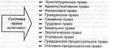 · Конституционное (государственное) право определяет: - основы государственного и общественного строя; - правовое положение личности; - систему органов государственной власти; - государственное устройство (территориальную организацию) и другие важнейшие положения. · Административное право содержит нормы, которые регулируют деятельность исполнительных и распорядительных органов государства (правительства, министерств, ведомств, местных органов управления), правовое положение государственной службы, административную ответственность. · Финансовое право регулирует отношения по сбору налогов, формированию государственного бюджета, расходованию государственных средств, их распределению и т.п. · Гражданское право регулирует имущественные отношения (купли-продажи, займа, собственности, наследования и т.п.), а также некоторые личные неимущественные отношения (например, защита чести и достоинства, право на имя и т.п.). · Семейное право также регулирует имущественные и личные неимущественные отношения, но лишь в сфере брачно-семейных отношений. · Земельное право связано с отношениями владения, пользования и распоряжения землей. · Экологическое право связано с охраной природы во всех ее сферах (вода, воздух, растительный и животный мир, недра) и природопользованием. · Трудовое право определяет условия возникновения, изменения и прекращения трудовых отношений, устанавливает продолжительность рабочего времени и времени отдыха, регулирует вопросы охраны труда, трудовой дисциплины и др. · Уголовное право отвечает на вопросы, какие общественно опасные деяния являются преступлениями и какие наказания за их совершение могут быть назначены.