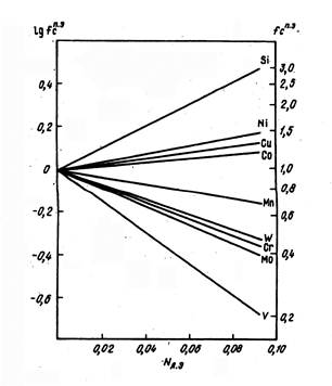 Рис. 15 - Влияние концентрации (мольной доли) Nл.с. различных легирующих элементов на относительный коэффициент термодинамической активности углерода в аустените при 1000°С Чем сильнее карбидообразующаяспособность легирующего элемента, т. е. чем левее по отношению к железу находится d-переходный металл в периодической системе, тем в большей степени понижается fс <1. Некарбидообразующие элементы в аустенитеСо, Ni, Si увеличивают значения fс > 1. Подобные данные для феррита имеются лишь по влиянию кремния. Влияние легирующих элементов на термодинамическую активность углерода в аустените имеет большое значение в таких процессах, как растворение карбидов, нитридов и карбонитридов в аустените, выделение их из твердого раствора при охлаждении, перераспределение элементов между фазами в процессе термической обработки. В заключение необходимо отметить, что легирующие элементы оказывают влияние на термодинамическую активность углерода в твердом растворе лишь в том случае, если они растворены в этом твердом растворе, т.е. при определении возможности протекания того или иного процесса благодаря изменению термодинамической активности необходимо учитывать содержание легирующих элементов, растворенных в твердом растворе, а не их общее содержание в стали.