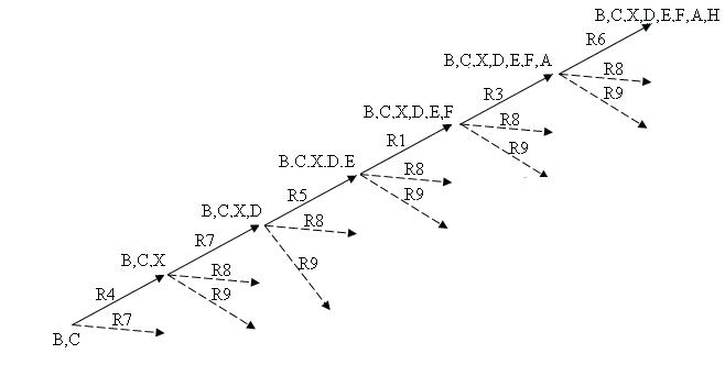 При выводе в прямом направлении рассуждения ведется с использованием правил, начиная с известных фактов, до тех пор, пока не будет достигнута цель. При этом могут использоваться различные стратегии выбора первого применяемого правила, например: