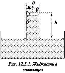 Поверхность смачивающей жидкости, находящейся в узкой трубочке (капилляре), принимает вогнутую форму, а не смачивающей – выпуклую. Такие изогнутые поверхности жидкости называются менисками. Пусть капилляр в виде цилиндрической трубки с радиусом канала r погружен одним концом в смачивающую его стенки жидкость (рис. 12.5.1). Мениск в нем будет иметь сферическую форму (R – радиус сферы). Под мениском давление жидкости будет на