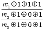 Закодировать кодом Хэмминга, исправляющим одну ошибку, информационную комбинацию двоичного кода 1101. В информационной комбинации содержится четыре информационных разряда, т.е. k =4. Согласно табл. 4.13 число контрольных символов m =3, и в соответствии с (4.6) размещаются они на позициях 1, 2 и 4, а информационные символы – на позициях 3, 5, 6 и 7 полной кодовой комбинации, в которой всего семь разрядов, так как n=k+m. Символы информационной части известны, а контрольные символы необходимо определить. Полную кодовую комбинацию можно записать в виде: т 1 m 2 k 4 m 3 k 3 k 2 k 1 ?? 1?1 0 1 Для определения контрольных символов заполняем табл. 4.15 значениями информационных символов и в полученной таким образом табл. 4.16 суммируем по модулю 2 информационные символы каждой строки.