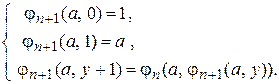 (Здесь надо найти наименьшее у, чтобы x× (y + 1) > z). В результате рассмотрения примеров функций, которые все являлись примитивно рекурсивными, возникает вопрос: существуют ли не примитивно рекурсивные функции. В данном случае ответ положительный, класс примитивно рекурсивных функций не исчерпывает класс всех вычислимых функций. Функция Аккермана. Построим функцию, которая является вычислимой, но не примитивно рекурсивной. Определим последовательность функций 1) 2) Продолжим последовательность по рекуррентному правилу 2):