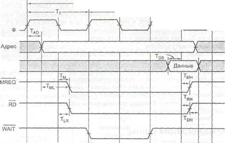 TML Промежуток между стабилиз ацией 6 адреса и установкой сигнала MREQ Тм Промежуток между задним фронтом 8 синхронизирующего сигнала в цикле Ti и установкой сигнала MREO TrL Промежуток между задним фронтом 8 синхронизирующего сигнала в цикле Т(и установкой сигнала RD TDS Период передачи данных до заднего 5 фронта синхронизирующего сигнала Тш Промежуток между задним фронтом 8 синхронизирующего_сигнала в цикле Т3 и сбросом сигнала MREQ Тин Промежуток между задним фронтом 8 синхронизирующего_сигнала в цикле Т3 и сбросом сигнала RD Тон Период продолжения передачи данных О с момента сброса сигнала RD