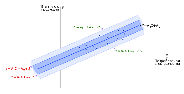 И, во-вторых, необходимо найти значение σ по формуле Если в полосу, ограниченную линиями Y Теор. – S и Y Теор. + S (рис. 2.5), попадает 68.26% и более экспериментальных точек Yi Эксп., то выдвинутая нами гипотеза принимается. В противном случае выбирают более сложную гипотезу или проверяют исходные данные. Если требуется б о льшая уверенность в результате, то используют дополнительное условие: в полосу, ограниченную линиями Y Теор. – 2 S и Y Теор. + 2 S, должны попасть 95.44% и более экспериментальных точек Yi Эксп..