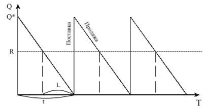 Рис. 2 Пусть: Q — размер заказа; T — протяженность периода планирования; D — величина спроса за период планирования; d — величина спроса в единицу времени; K — издержки заказа (затраты на транспортировку, доставку продукции); H — удельные издержки хранения за период; h — удельные издержки хранения в единицу времени; L — количество дней поставки (период поставки товарной продукции).