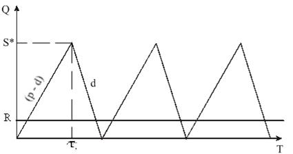 Рис. 1 Пусть: Q — размер заказа; T — протяженность периода планирования; D — величина спроса за период планирования; d — величина спроса в единицу времени; K — издержки заказа (затраты на транспортировку, доставку продукции); H — удельные издержки хранения за период; h — удельные издержки хранения в единицу времени;