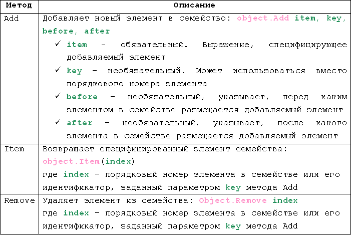 Семейства объектов имеют одно общее свойство Count, возвращающее число элементов семейства и три метода: