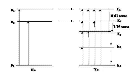 Упрощённая схема энергетических уровней He-Ne лазера изображена на рисунке 1.23. В гелий-неоновом лазере активным веществом являются нейтральные атомы Ne. При электрическом разряде часть атомов Ne переходит с основного уровня E1 на возбуждённый верхний уровень E5. Но в чистом Ne время жизни на этом уровне мало и атомы быстро переходят с него на нижние уровни E4, E3, E2 и E1, что препятствует созданию инверсной населённости. Примесь He существенно меняет ситуацию. Возбуждённые энергетические уровни атома гелия F2 и F3 совпадают с верхними уровнями E5 и E4 неона. Поэтому при столкновении возбуждённых электронным ударом атомов He, с невозбуждёнными атомами Ne (с энергией E1) происходит передача возбуждения, в результате которой атомы Ne переходят на уровни E5 и E4, а атомы He возвращаются в основное состояние F1. При достаточно большом числе атомов He в газовой смеси можно добиться преимущественного заселения уровней E5 и E4 неона. Этому же способствует опустошение уровня E3, происходящее при соударении атомов неона со стенками газоразрядной трубки. Уровни E5, E4, E3 обладают сложной структурой, т.е. состоят из множества подуровней. В результате гелий-неоновый лазер может работать на 30 длинах волн, из которых наиболее эффективными и востребованными являются 0.63 мкм и 1.15 мкм. Несмотря на малый КПД этих лазеров, их излучение обладает высокой монохроматичностью, а конструкция самого лазера достаточно проста и надёжна.