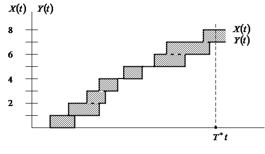 Но этот интеграл представляет собой не что иное, как площадь фигуры, заштрихованной на рисунке. Фигура состоит из прямоугольников, каждый из которых имеет высоту, равную единице, и основание, равное времени пребывания в системе соответствующей заявки (первой, второй и т.д.). Обозначим эти времена