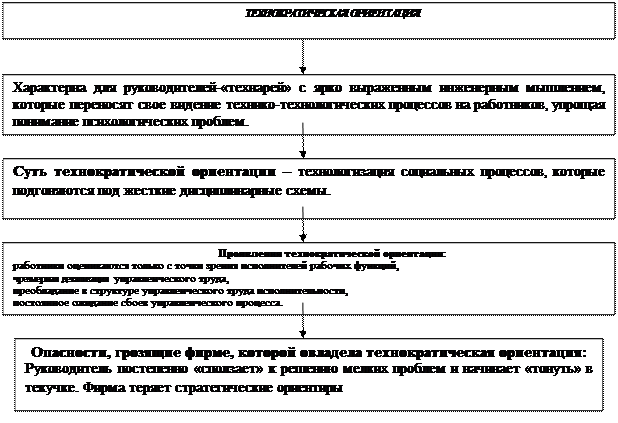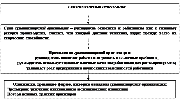 Каждая из ориентаций является идеально-типической. В реальности управленческие отношения располагаются в континууме между крайними ориентациями. Выбор управленческой ориентации осуществляется преимущественно на основе предпочтений конкретного руководителя. Представим каждую из управленческих ориентаций в виде схемы.
