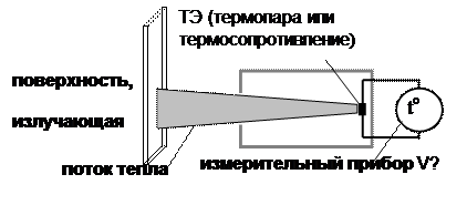 Поток тепла от поверхности, температура которой измеряется, нагревает термочувствительный элемент (ТЭ) (см.1, 2), преобразующий тепло в ЭДС. По значению ЭДС судят о температуре поверхности.
