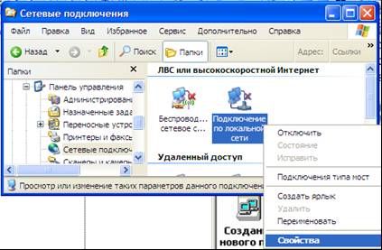 Рис.7 1. Выбрать значок «Сеть и удаленный доступ к сети«панели управления компьютера 2. В раскрывшемся диалоговом окне выбрать значок «Подключения по локальной сети» и в контекстном меню вызвать окно настройки свойств сетевого подключения.