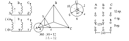Рис. 1.26. Схема соединения и векторные диаграммы ЭДС для соединения трансформатора Y/∆