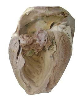 Рис. 4.5.4 Тромбэндокардит при хроническом течении рожи свиней На створках митрального клапана видны массивные сероватые тромботические наложения, прочно соединены с эндокардом. При их снятии образуются язвы.
