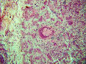 Рис. 4.6.13 Гематогенный туберкулез печени свиньи Видна гигантская клетка Пирогова-Лангханса, характерная для туберкулезных поражений.