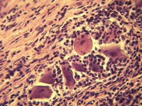 Рис. 4.8.2 Ганглионит при бешенстве Симпатический ганглий с диффузной воспалительной инфильтрацией.