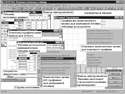 В пакете STATISTICA все операции, включая копирование, перетаскивание и автоматическое заполнение ячеек, производятся так же, как в популярных электронных таблицах. При нажатии правой кнопки мыши появляется всплывающее меню, где точно так же предлагается перечень операций, которые можно выполнить над выделенным объектом. Общее число переменных в стандартном файле STATISTICA может быть до 4092, количество наблюдений ограничено лишь объемом жесткого диска. В системе имеется также менеджер мегафайлов (доступный из модуля Управление данными), который позволяет работать с очень большими файлами, содержащими до 32000 переменных. Система STATISTICA предоставляет всесторонние возможности по импорту и экспорту данных, в том числе и из таблиц Excel.