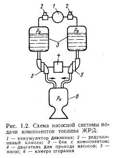 где Обычно плотность окислителя (производные азотной кислоты, жидкий кислород и пр.) больше, чем плотность горючего (керосин, спирты и пр.), поэтому разница в объемных расходах окислителя и горючего меньше, чем разница в их массовых расходах. Объемные расходы компонентов составляют тысячные и сотые доли кубических метров в секунду для двигателей с умеренной тягой (до 300 кН) и десятые доли кубических метров в секунду для двигателей с большей тягой. Давление подачи рабочего компонента