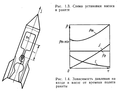 где Во время полета ракеты давление на входе в насос не остается постоянным, а меняется при изменении ускорения и уровня жидкости в баке. Па рис. 1.4 показано изменение давления на входе в насос по времени полета ракеты на активном участке траектории, когда работает двигатель. При старте ракеты Определенная трудность заключается в осуществлении запуска в условиях невесомости. Нельзя обеспечить в этих условиях непрерывную подачу жидкого компонента к насосу, не принимая специальных мер по разделению жидкой фазы компонента и газа (пара) для наддува. Для обеспечения притока жидкого компонента к насосу могут быть применены капиллярные системы, сетчатые экраны, центробежные сепараторы, вспомогательные двигатели, обеспечивающие необходимое ускорение для прилива компонента к днищу бака, и т. п. Отметим, что входное давление При наличии бустерного насоса давление на входе в основной насосный агрегат определяется давлением за бустерным насосом. Это давление выбирается таким, чтобы обеспечить работу основного насоса без кавнтационного срыва, обычно это давление не менее 1 МПа. Зная потребное давление на выходе из насоса