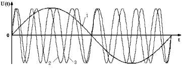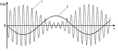 Рисунок 21 - Амплитудно-модулированный(1) и модулирующий (2) сигнал Амплитудно-модулированные сигналы описываются формулой где m - глубина амплитудной модуляции (всегда меньше единицы). При частотной модуляции (рисунок 22) измерительная информация содержится в частоте модулированного сигнала, т.е.