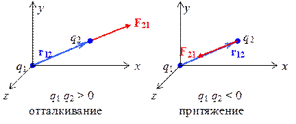 Рис. 1.2.1. Взаимодействие неподвижных электрических зарядов называют электростатическим, а, если заряды точечные, то кулоновским взаимодействием. Силы взаимодействия подчиняются третьему закону Ньютона: