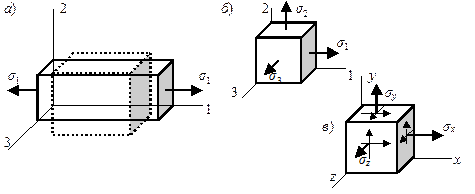 Рис. 5.1. Одно и трехосное напряженное состояние В случае трехосного растяжения частица упругого тела подвержена одновременному действию трех главных напряжений (рис. 5.1, б). От действия напряжений по оси 2 в частице появятся деформации, которым, по аналогии с (5.2), присвоим верхний индекс, совпадающий с индексом напряжения σ 2: