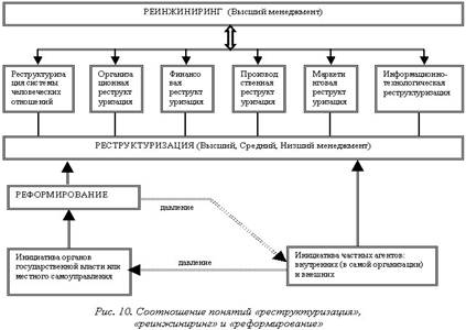 В настоящее время в России сложилось два наиболее распространенных понимания термина «реструктуризация»: 1) реструктуризация в смысле изменения (перераспределения или переопределения) прав собственности и связанного с этим изменения организационно-правовой формы; 2) как принятие новой схемы выплаты задолженности организации, включая отсрочку или рассрочку платежей, а также получение кредитов для выплаты текущей части задолженности и/или процентов по ней. Проведения реструктуризации согласно указанным определениям в современных условиях недостаточно. Изменяется форма, но не содержание деятельности организации. Современные подходы к определению реструктуризации (Л. Родионовой, Е. Гриншпуна, А. Алпатова, Л. Водачека) также описывают только отдельные стороны процесса реструктуризации, поэтому мы даем собственное определение данного термина. Реструктуризация — это преобразование организации, обусловленное характером и динамикой изменений внешней среды и имеющее своей целью повышение эффективности деятельности организации и синхронизацию внутренних изменений с внешними. При этом понятия «реструктуризация» и «реформирование» разграничиваются, как показано на рис. 10.