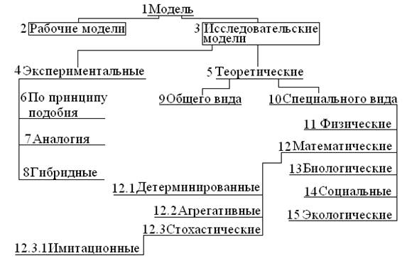 Рабочие модели (например, искусственное сердце – это модель, копирующая свойства органов) – это системы обладающие теми же свойствами, и предназначены не для изучения, а для замены. Исследовательские модели – созданы для изучения свойств исходного объекта, которого сложно изучать. Экспериментальные модели – это реальные системы, которые обладают свойствами исходной системы. Подобие (по внешним признакам) для изучения свойств зависящих от внешних признаков (моделируется только форма, например, самолет). Аналогия – системы внешне разные, но обладают аналогичными свойствами. Гибридные – такие модели сочетают и аналогию и подобие (например, обучение пилота перед монитором, т.е. подобие – кабина, аналогия – реакция модели на действие пилота). Общего вида – глобальные теории (всемирного тяготения и т.д.) охватывают общие свойства окружающего мира. Специальные теории – теории в отдельных областях знаний. Детерминированные – эти модели описываются при помощи дифференциальных уравнений. Стохастические – это модели, в которых применяются методы теории вероятности для описания поведения таких систем.
