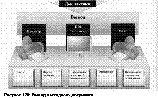 Выходные документы Возможен вывод всех документов закупки в качестве выходных документов. Каждый раз при создании запроса поставщику, заказа на поставку, контракта или соглашения о поставках система создает на основе соответствующего документа выходной документ. Затем этот выходной документ помещается в очередь сообщений. Очередь сообщений содержит все выходные документы, которые еще не переданы поставщикам. Существуют следующие варианты вывода выходных документов из очереди сообщений (с помощью печати, электронной почты, факса или электронного обмена данными (EDI)): • Немедленный вывод Система выводит выходной документ непосредственно из очереди, другими словами, сразу после сохранения документа. • Позднейший вывод