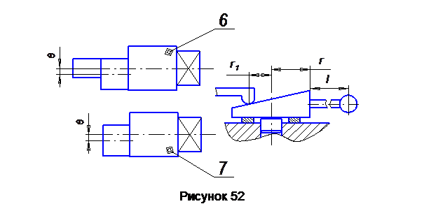 6 и 7 – эксцентриковые валики (рис 52). Применяются в качестве запирающих механизмов для точно исполненных подвижных частей приспособлений. В этих случаях не требуется значительный эксцентриситет, а следовательно, можно применить валик малого диаметра. предпочтение следует отдавать двухопорным валикам 6, как более жестким и надежным против изгиба. Рабочая поверхность эксцентриков может выполняться в виде окружности и криволинейной – в виде эвольвенты и спирали Архимеда. Различие их в том, что в развертке круговых эксцентриков клин получается криволинейным с предельным углом a, отсюда нестабильность зажима. В то же время технология изготовления круговых эксцентриков значительно проще, чем криволинейных. Самотормозящие свойства эксцентриков увеличиваются с увеличением угла поворота. Рекомендуемый угол поворота aэ = 30 - 135° Материал для эксцентриков – сталь 20Х с цементацией на глубину 0,8 – 1,2 мм и закалкой до HRC 55…60.