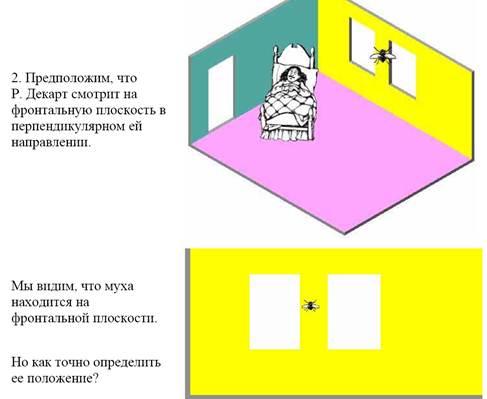 Существует несколько легенд об изобретении системы координат, которая носит имя Декарта. Однажды Рене Декарт весь день пролежал в кровати, думая о чем-то, а муха жужжала вокруг и не давала ему сосредоточиться. Он стал размышлять, как бы описать положение мухи в любой момент времени математически, чтобы иметь возможность прихлопнуть ее без промаха. И... придумал декартовы координаты, одно из величайших изобретений в истории человечества. Проследим путь открытия системы координат согласно этой легенде в картинках. Время открытия: 1637 год. На рисунке условно показаны три стены кабинета: