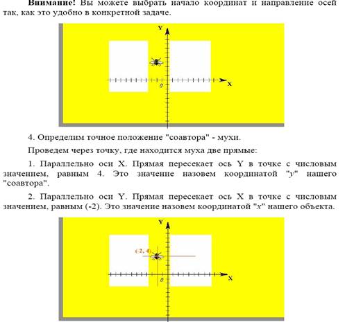 Принято координаты объекта, обычно точки, записывать в форме (x, y). Для нашей мухи мы можем сказать, что она находится в точке с координатами (-2, 4). Задача точного определения положения мухи решена! Новизна идеи состоит в том, что положение точки или объекта на плоскости определяетcя с помощью двух пересекающихся осей.