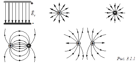 Електричне поле можна наочно представити за допомогою так званих ліній напруженості електричного поля (силових ліній) (Рис. 3.1.1). Вони проводяться так, щоб дотична, проведена до цих ліній, у кожній точці збігалася б з вектором напруженості. Електричне поле, у якому напруженість у всіх точках однакова за модулем і напрямком, називається однорідним, а в протилежному випадку – неоднорідним.
