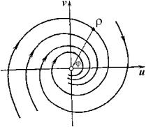 Таким образом, на фазовой плоскости u, v мы имеем дело с семейством логарифмических спиралей, каждая из которых имеет асимптотическую точку в начале координат. Особая точка, которая является асимптотической точкой всех интегральных кривых, имеющих вид спиралей, вложенных друг в друга, называется фокусом ( рис.4.8 ).