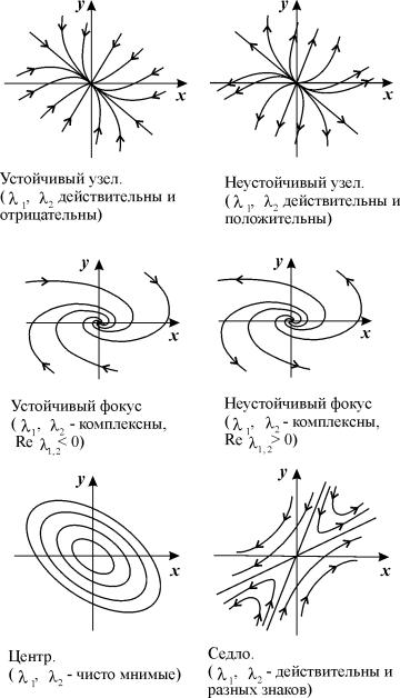 Рис. 4.9. Типы фазовых портретов в окрестности стационарного состояния для системы линейных уравнений (4.4). Пять типов состояния равновесия грубые, их характер не изменяется при достаточно малых изменениях правых частей уравнений (4.4). При этом малыми должны быть изменения не только правых частей, но и их производных первого порядка. Шестое состояние равновесия – центр – негрубое. При малых изменениях параметров правой части уравнений он переходит в устойчивый или неустойчивый фокус.