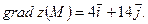 Градиент – характеристика, показывающая направление и величину максимальной скорости изменения функции в данной точке. Пусть Градиентом функции Теорема 7.1. Градиент функции Итак, градиент – вектор, направленный в сторону наибольшего возрастания функции и равный по величине мгновенной скорости возрастания функции. Пример 7.6. Найти градиент функции Решение. Вычислим частные производные Пример 7. 7. Найти наибольшую скорость возрастания функции Решение. Найдем частные производные и их значения в точке М: Градиент функции в точке есть вектор