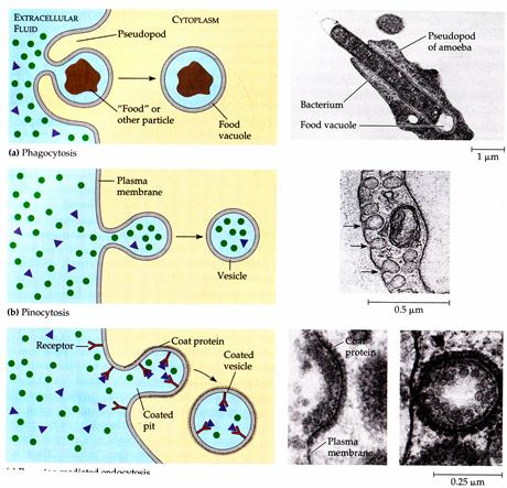 Активный транспорт – наиболее важная форма транспорта для клетки. Диффузия, если она продолжается достаточно долго, приводит к тому, что по обе стороны мембраны устанавливается равновесие, что недопустимо для клетки – это для нее смерть. Состав цитоплазмы и межклеточной жидкости сильно различаются. Поэтому в клетке существует система «активного транспорта». В этом случае транспорт молекул осуществляется против градиента концентрации (из зоны низкой концентрации в зону высокой). Для этого существуют специальные белковые мембранные комплексы (ионные и молекулярные каналы), работающие с затратой энергии. До 40% всей энергии, вырабатываемой клеткой, идет на транспортные расходы! Транспорт в мембранной упаковке (эндоцитоз и экзоцитоз). Во многих случаях клетка должна транспортировать через мембрану не отдельные молекулы или ионы, а целые молекулярные комплексы и даже частицы. Они через мембранные поры не проходят. В связи с этим, в клетке существует специальная разновидность транспорта – транспорт в мембранной упаковке. Фагоцитоз (поедание клеткой) — процесс поглощения клеткой твёрдых объектов, таких как клетки эукариот, бактерии, вирусы, остатки мёртвых клеток и т. п. Вокруг поглощаемого объекта образуется большая внутриклеточная вакуоль (фагосома). Размер фагосом — от 250 нм и больше. Путем слияния фагосомы с первичной лизосомой образуется вторичная лизосома. В кислой среде гидролитические ферменты расщепляют макромолекулы, оказавшиеся во вторичной лизосоме. Продукты расщепления (аминокислоты, моносахариды и прочие полезные вещества) транспортируются затем через лизосомную мембрану в цитоплазму клетки. Фагоцитоз распространен очень широко. У высокоорганизованных животных и человека процесс фагоцитоза играет защитную роль. Фагоцитарная деятельность лейкоцитов и макрофагов имеет огромное значение в защите организма от попадающих в него патогенных микробов и других нежелательных частиц. Фагоцитоз впервые описал Лауреат Нобелевской премии Русский ученый И.И. Мечников. Пиноцитоз (питьё клеткой) — процесс поглощения клеткой жидкой фазы из окружающей среды, содержащей растворимые вещества, включая крупные молекулы (белки, полисахариды и др.). При пиноцитозе от мембраны отшнуровываются внутрь клетки небольшие пузырьки — эндосомы. Они меньше фагосом (их размер до 150 нм) и обычно не содержат крупных частиц. После образования эндосомы к ней подходит первичная лизосома, и эти два мембранных пузырька сливаются. Образовавшаяся органелла носит название вторичной лизосомы. Процесс пиноцитоза постоянно осуществляют все эукариотическме клетки. Рецептор-опосредованный эндоцитоз — активный специфический процесс, при котором клеточная мембрана выпучивается внутрь клетки, формируя окаймлённые ямки. Внутриклеточная сторона окаймлённой ямки содержит набор адаптивных белков (адаптин, клатрин, обуславливающий необходимую кривизну выпучивания и др. белки). Макромолекулы, связывающиеся со специфическими рецепторами на поверхности клетки, проходят внутрь со значительно большей скоростью, чем вещества, поступающие в клетки за счет пиноцитоза. Внешняя сторона мембраны при этом включает специфические рецепторы (например, ЛПНП-рецептор). При связывании лиганда из окружающей клетку среды окаймлённые ямки формируют внутрикл