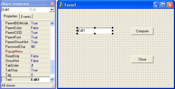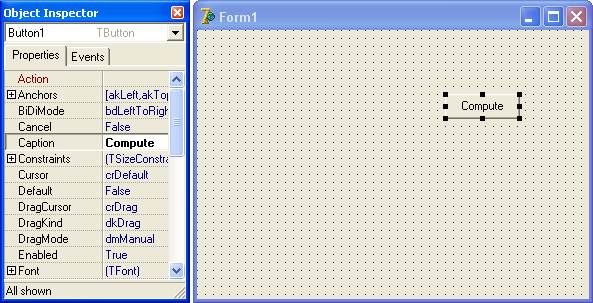 Ваше дело — сделать из заготовки "конфетку"! С помощью мыши подправьте ее местоположение. После этого перейдите к окну Object Inspector. Там вы увидите список свойств компонента Button. В нем нас интересует свойство Caption, так как именно оно определяет содержимое надписи. Заменим в свойстве Caption стандартное значение Button1 на Compute (рисунок 1.18).
