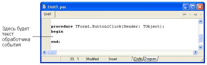 Теперь займемся кнопкой Close. Обработчик события для нее устанавливается аналогично: кнопка активизируется на форме, в окне Object Inspector выбирается вкладка Events и на значении события OnClick делается двойной щелчок мыши. Текст этого обработчика еще проще, чем текст предыдущего: