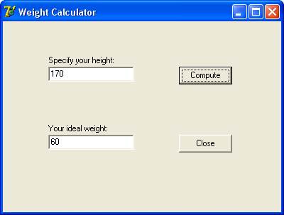 Все файлы, которые относятся к решению задачи и составляют проект, будут записаны на диск в заданный каталог. Сохраненный проект может быть открыт для доработки в любой момент. Теперь давайте поработаем с программой по-настоящему. Запустите ее (с помощью команды меню Run | Run), активизируйте поле с надписью Specify your height и введите значение роста (170 см). Исходный материал есть, пора начать вычисления. Нажмите кнопку Compute. В выходном поле появится значение 60 (рисунок 1.28):
