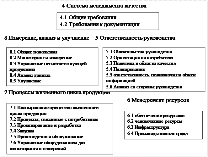 В состав стандарта включены четыре основных раздела, пункты, которых определяют систему менеджмента качества, ответственность руководства, менеджмент ресурсов, процессы жизненного цикла продукции, а также измерение, анализ и улучшение. Состав требований ГОСТ ISO 9001-2011 приведен на рисунке 7.