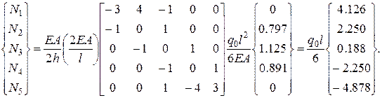 Рисунок 19. Изменение продольного усилия по длине стержня (решение с помощью дифференцирующей матрицы - вариант А)