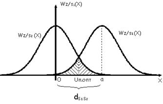 Z/Si(x) – означает, что при передаче Si на приёмник поступил Z. Uпорог.опт.=dS1S2/2; dS1S2=a Заштрихованные области на рисунке – вероятности ошибок справа -