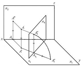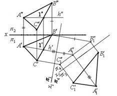 Сущность способа замены плоскостей проекций заключается в том, что одну из заданных плоскостей проекций заменяют на новую, перпендикулярную одной из существующих плоскостей проекций Выбор положения новой плоскости проекций зависит от условия задачи. При решении задачи выполняют одну или последовательно 2 замены. Переход может быть осуществлен по одной из следующих схем: