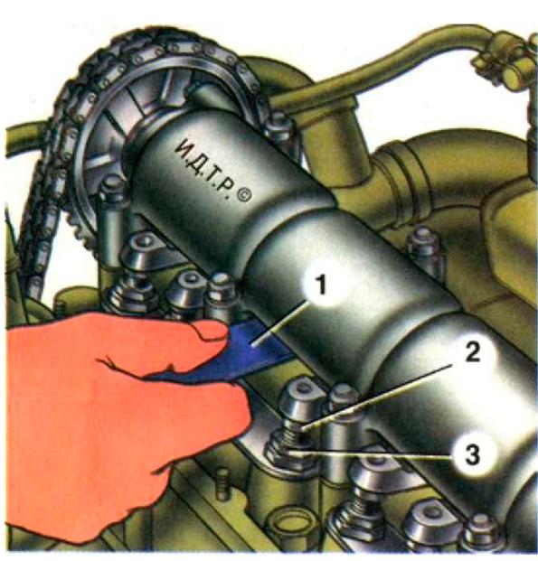 Рис.. Проверка зазора между рычагами и кулачками распределительного вала: 1 - щуп; 2 - регулировочный болт; 3 - контргайка регулировочного болта. Тепловой зазор между рычагом и кулачком распределительного вала регулируется на холодном двигателе. Этот зазор составляет доли миллиметра и контролируется специальным щупом. Конкретный зазор, необходимый конкретному двигателю, указан в руководстве по его эксплуатации. Известно, что при нагреве тела расширяются, в том числе и детали газораспределительного механизма. Если тепловой зазор станет меньше необходимого, то клапан откроется на большую величину, но самое неприятное то, что он не успеет закрыться в нужный момент либо из-за теплового удлинения его ножки останется приоткрытым. Все это приведет к снижению мощности двигателя, а его длительная эксплуатация в таких условиях - к «прогару» клапана и выходу двигателя из строя. Увеличенный сверх нормы тепловой зазор приведет к тому, что клапан не сможет открываться полностью. Такое нарушение регулировки впускного клапана не позволит горючей смеси в нужном количестве заполнить цилиндр, а выпускного - затруднит очистку цилиндров от отработавших газов. Гидрокомпенсаторы