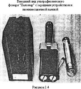 Ультрафиолетовый осветитель представляет собой наполненный инертным газом (например, аргоном) кварцевый сосуд, на внутреннюю поверхность которого нанесено небольшое количество распылённой ртути и в который вмонтированы электроды. При подаче напряжения на электроды образуются пары ртути, через которые проходят электроны, вызывая световой поток, богатый УФ-лучами. Поскольку обычное стекло в значительной степени поглощает УФ-лучи.то фильтр, поглощающий видимый свет, делают, как правило, из кварца или специального вида стекла. В качестве ультрафиолетовых осветителей таможенные органы в настоящее время используют три модификации фонарей. Одна из этих моделей - УФ-фонарь "Паломар" (фирма-поставщик "Helling", Германия), которой оснащались таможни в период 1981-82гг. (Рис. 1.4.). Это достаточно габаритный фонарь размерами: 380х60х90мм и весом 710г. Он состоит из преобразователя напряжения, находящегося в одном корпусе с аккумуляторными источниками питания, и двух сменных ламп. Одна из них является источником люминесцентного освещения для исследований в видимом свете, другая, устанавливаемая на её место, для создания УФ-излучения. Угол излучения в горизонтальной плоскости составляет 210 градусов, в вертикальной-150 градусов. Расстояние, с которого обеспечивается нормальная освещённость объекта, составляет 16см. На защитных баллонах ламп и крышках батарейного отсека установлены резиновые уплотнители, что позволяет использовать фонарь во влажных и взрывоопасных средах. Мощность потребляемая лампой, составляет 6 вт. На корпусе фонаря установлен достаточно сильный магнит, с помощью которого фонарь можно крепить к металлическим конструкциям, чтобы освободить руки оперативного работника. Фонарь может работать в интервале рабочих температур от - 5 до + 50 градусов С°. Длительность непрерывной работы фонаря при полностью заряженных аккумуляторах - не менее 2-х часов. Для подзарядки источников питания к фонарю придаётся сетевое зарядное устройство, обеспечивающее цикл зарядки аккумуляторов - 15 час. Вес его - 640 г. Из-за достаточно больших габаритов и веса, фонарь практически очень редко использовался в оперативных условиях. Второй моделью УФ-фонаря, применяемой в оперативной работе таможенных органов, является модель "81600", фирма-поставщик "Helling" (Германия). Внешний вид фонаря представлен на Рис. 1.5. Этот УФ-фонарь, в отличие от осветителя "Паломар", - карманного типа, работает в длинноволновом диапазоне ультрафиолетового излучения.