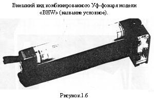 В комплект УФ-осветителя модели "81600" входит зарядное устройство, обеспечивающее цикл полной зарядки аккумуляторов в течение 8 часов, среднее количество зарядно-разрядных циклов аккумуляторов - 1000. Габариты его -210х100х500мм, вес-500г. Конструктивно зарядное устройство выполнено в виде прямоугольной пластмассовой коробки, на верхней части которой установлены: крышка, закрывающая доступ в пятисекционный аккумуляторный отсек, четыре светодиода индикации тока заряда, тумблер переключения рода работы и сигнальная лампочка, индицирующая напряжение на аккумуляторах. Малогабаритный, лёгкий, с достаточной мощностью УФ-излучения и временем непрерывной работы УФ-фонарь модели "81600" отлично зарекомендовал себя в оперативной практике проверки подлинности таможенных документов и целостности атрибутов таможенного обеспечения. В настоящее время завершается разработка отечественного аналога этой модели под шифром "Поиск". Все детали его будут выполнены на отечественной элементной базе за исключением УФ-лампы. К сожалению, УФ-лампы такого размера и с такими техническими параметрами отечественная промышленность не выпускает, поэтому УФ-фонари "Поиск" будут оснащаться специально для них закупленными в Германии лампами. Вместе с тем, опыт оперативной работы показывает, что и модель "81600" не во всех случаях удовлетворяет условиям, в которых работают сотрудники оперативных подразделений таможен. Зачастую при проверке таможенных документов и атрибутов таможенного обеспечения в сочетании с ультрафиолетовым излучением требуется (попеременно) проведение осмотра в видимых лучах. Это заставляет использовать отдельно ещё и карманные электро-фонари, что вызывает определенные затруднения и неудобства при проведении контроля. Эти недостатки полностью исключены в новой модели комбинированного УФ-фонаря типа "BHW" (название условное), которым будут снабжаться таможенные органы Казахстана (Рис. 1.6). Фонарь выполнен в виде комбинации 3-х осветителей: собственно ультрафиолетового, имеющего полностью аналогичные технические параметры УФ-фонарей модели "81600" (даже используется один и тот же тип УФ-лампы); фонаря видимого освещения, выполненного в виде поворачивающейся головки с лампочкой и отражателем (угол поворота головки от +90 до -45 град.) и мигающего фонаря-"маячка" (частота мигания - 2 сек).
